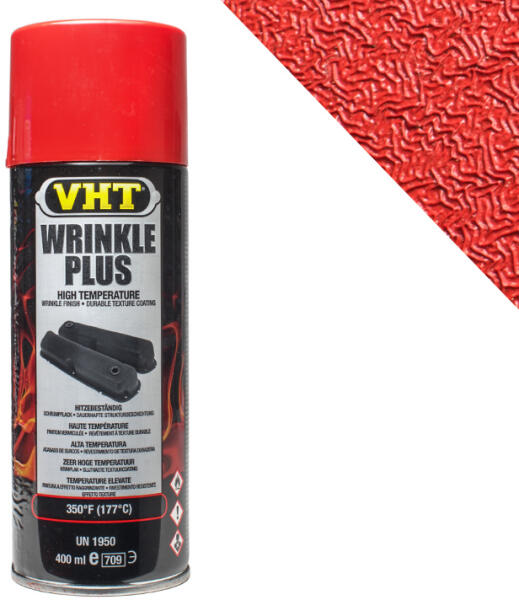 VHT Wrinkle Plus a szín a merész és gazdag fekete színt mély és gazdag textúrával ötvözi az egyedi és eredeti megjelenés érdekében. 177°C (350°C) hőmérsékletig ellenálló képességének köszönhetően ideálisan használható szívócsonkon, szelepfedélen, indítókon, generátorokon és egyéb fémfelületeken.