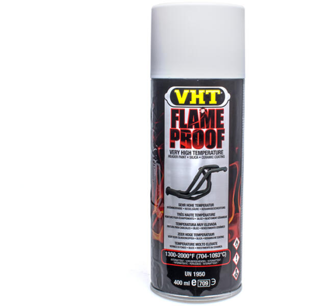 A VHT Flameproof hőálló matt fehér festék helyreállítja és meghosszabbítja az extrém hőmérsékletnek kitett felületek élettartamát (akár 1093°C-ig). Az autóiparban leggyakrabban ejtőcsövek és egyéb kipufogó alkatrészek vagy motorblokkok és fejek festésére használják.
